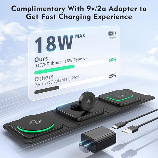 - Cargador inalámbrico magnético 3 en 1: nuestro cargador plegable Mag-Safe está equipado con un adaptador de 18 W de alta calidad, lo que te permite cargar completamente tu dispositivo en solo 2 a 2.5 horas, un 25% más rápido que otros cargadores inalámbricos. Es compatible con iPhone 15 Series/14/14 Pro/14 Plus/14 Pro Max/13/13 Pro/13 Pro Max/12/12 Pro/12 Pro Max, también es compatible con Apple Watch Ultra 9 8 7 6 5 4 3 2 y AirPods con carga inalámbrica.