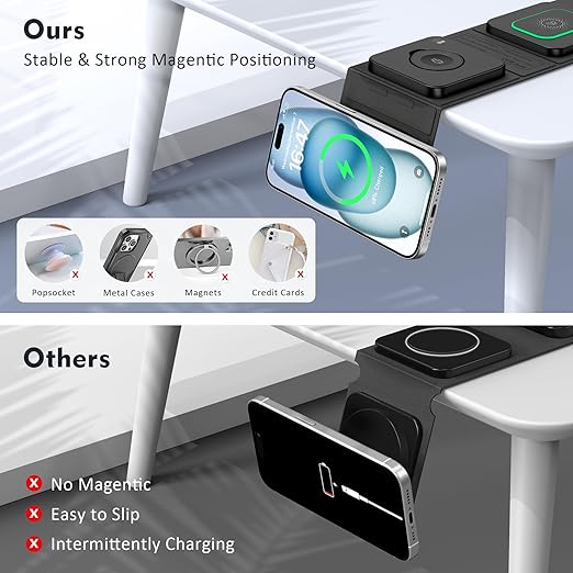 - Alineación magnética y fuerte absorción: nuestro estador de carga 3 en 1 con imanes de alta calidad, garantiza una alineación sin esfuerzo con la bobina de carga de tu teléfono, garantizando una experiencia de carga rápida y estable. Ya no tendrás que buscar la posición perfecta. Simplemente coloca tu iPhone en el cargador y deja que haga el resto.
