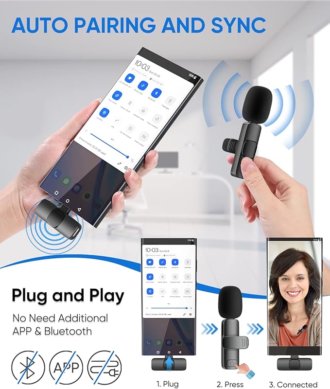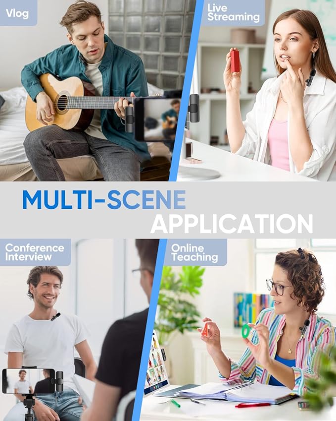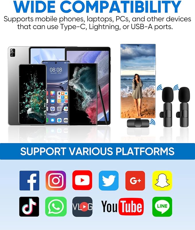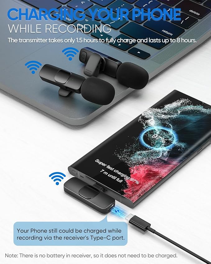 - Tiempo de trabajo de 8 horas: el transmisor de micrófono inalámbrico tiene una batería recargable integrada y un chip de baja potencia para hasta 8 horas de tiempo de trabajo, y una carga completa tarda solo 1.5 horas. El receptor es alimentado por tu dispositivo con un puerto de carga para cargar tu teléfono móvil mientras grabas videos, no más pánico por batería baja. Perfecto para YouTube, Tik Tok, transmisión en vivo, grabación de video, entrevistas, reuniones en línea, etc.